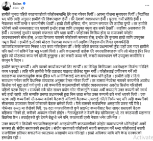 ‘नेताज्युहरुले त देशनै बेच्न खोजिसक्नु भो, तर काठमाडौँ महानगर बिक्रीमा छैन । तपाईँहरूले पुरै देशनै बेच्नुभो भने पनि, काठमाडौँ एक्लै नेपाल भनेर उभिनेछ ‘ आज सामाजिक सञ्जालमार्फत उनले भनेका छन् ।