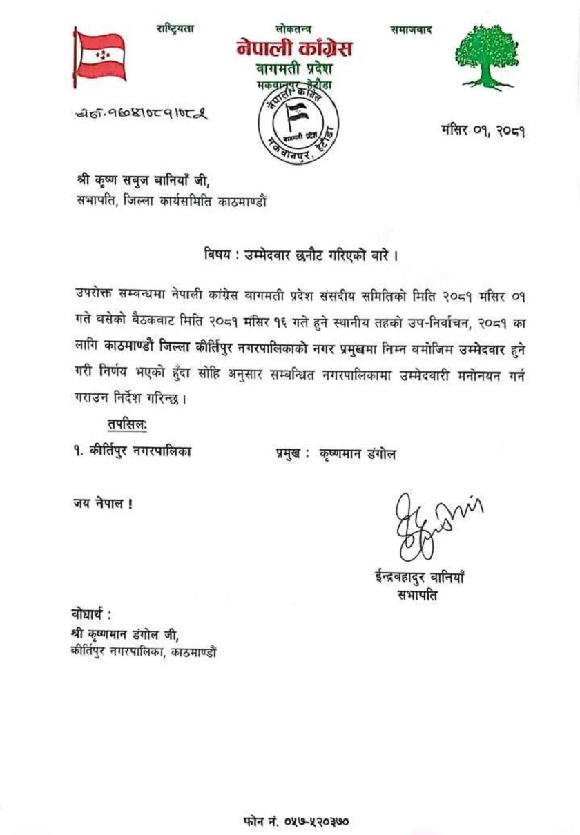 मंसिर १६ गते हुने स्थानीय तहको उपनिर्वाचनका लागि सो नगरपालिकाको प्रमुखमा डंगोललाई उठाउने निर्णय भएको कांग्रेस बागमती प्रदेशका सभापति इन्द्रबहादुर बानियाले कांग्रेस जिल्ला कार्य समिति काठमाडौँलाई परिपत्रमार्फत जानकारी गराएका छन् ।