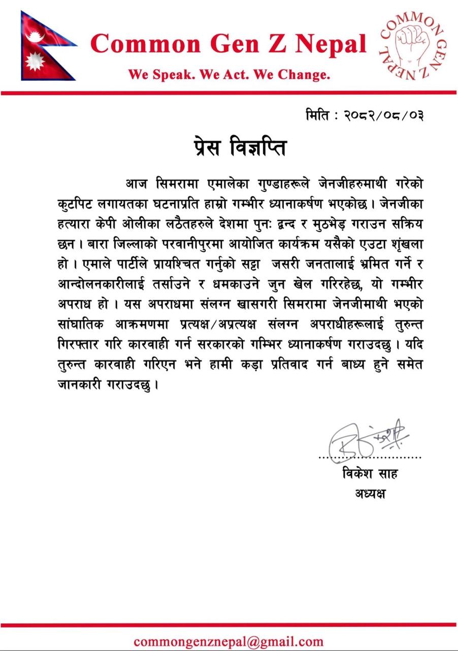 ‘जेनजीका हत्यारा केपी ओलीका लठैतहरुले देशमा पुनः द्वन्द र मुठभेड़ गराउन बारा जिल्लाको परवानीपुरमा कार्यक्रमको आयोजना गरेको थियो । यस्ता कार्यक्रम मार्फत एमाले पार्टीले लगातार आन्दोलनकारीलाई तर्साउने र धमकाउने जुन खेल गरिरहेछ, यो गम्भीर अपराध हो । यस अपराधमा संलग्न खासगरी सिमरामा जेनजीमाथी भएको सांघातिक आक्रमणमा प्रत्यक्ष/अप्रत्यक्ष संलग्न अपराधीहरूलाई तुरुन्त गिरफ्तार गरि कारवाही गर्न सरकारको गम्भिर ध्यानाकर्षण गराउदछु,’ Common Gen-Z Nepal अध्यक्ष साहले जारी गरेको विज्ञप्तीमा उल्लेख गरिएको छ ।