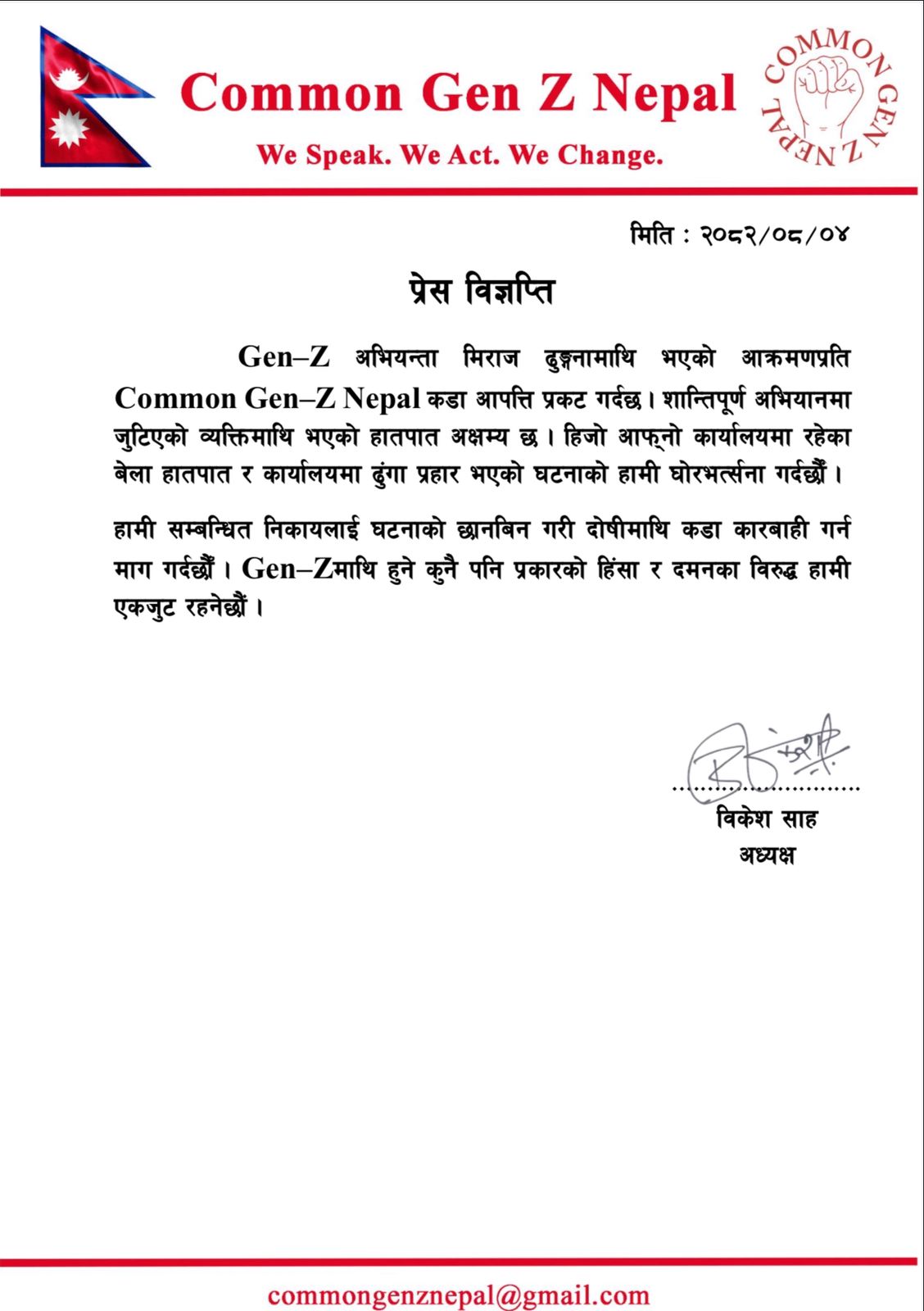 ‘जेनजी अभियन्ता मिराज ढुङ्गनामाथि भएको आक्रमणप्रति Common Gen-Z Nepal कडा आपत्ति प्रकट गर्दछ । शान्तिपूर्ण अभियानमा जुटिएको व्यक्तिमाथि भएको हातपात अक्षम्य छ । हिजो आफ्नो कार्यालयमा रहेका बेला हातपात र कार्यालयमा ढुंगा प्रहार भएको घटनाको हामी घोरभत्र्सना गर्दर्छौं । हामी सम्बन्धित निकायलाई घटनाको छानबिन गरी दोषीमाथि कडा कारबाही गर्न माग गर्दछौँ । जेनजीमाथि हुने कुनै पनि प्रकारको हिंसा र दमनका विरुद्ध हामी एकजुट रहनेछौं,’ अध्यक्ष साहले जारी गरेको विज्ञप्तीमा उल्लेख गरिएको छ ।